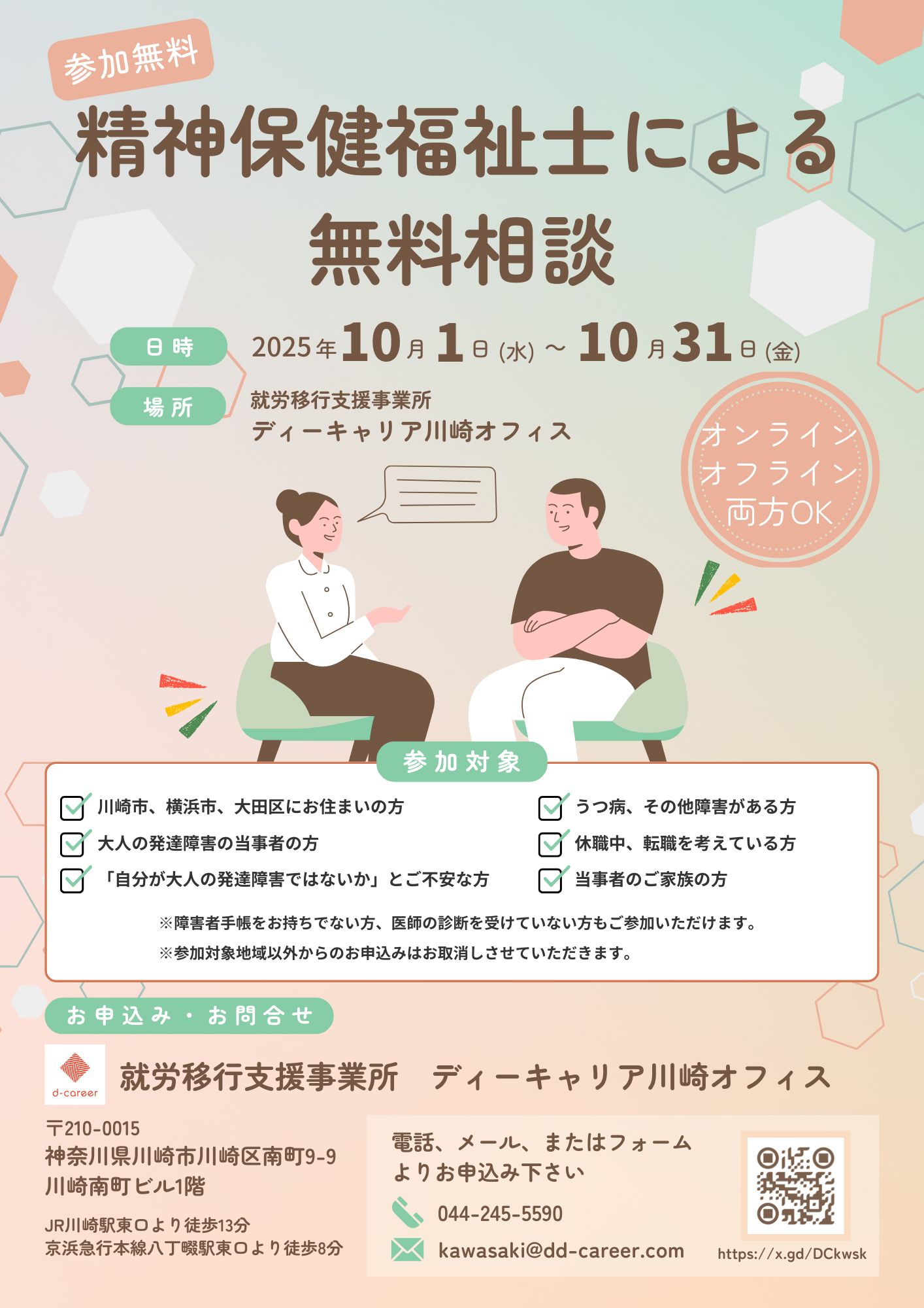 【ディーキャリア川崎オフィス】10月1日(金)~10月31日(日)「【精神保健福祉士】による【無料相談】発達障害、その他障害の特性による困りごとのある方向け!」