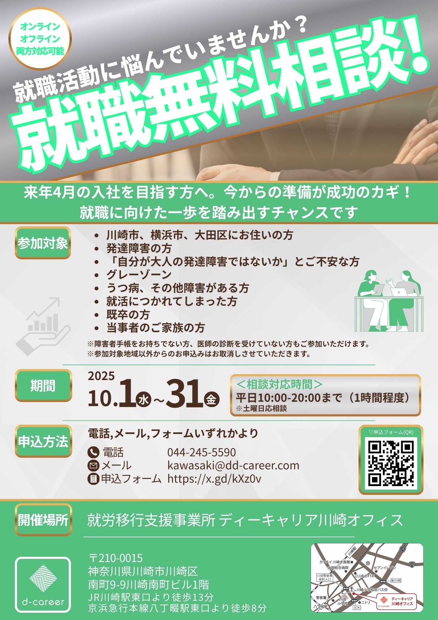 【ディーキャリア川崎オフィス】10月1日(金)~10月31日(日)「【精神保健福祉士】による【無料相談】発達障害、その他障害の特性による困りごとのある方向け!」