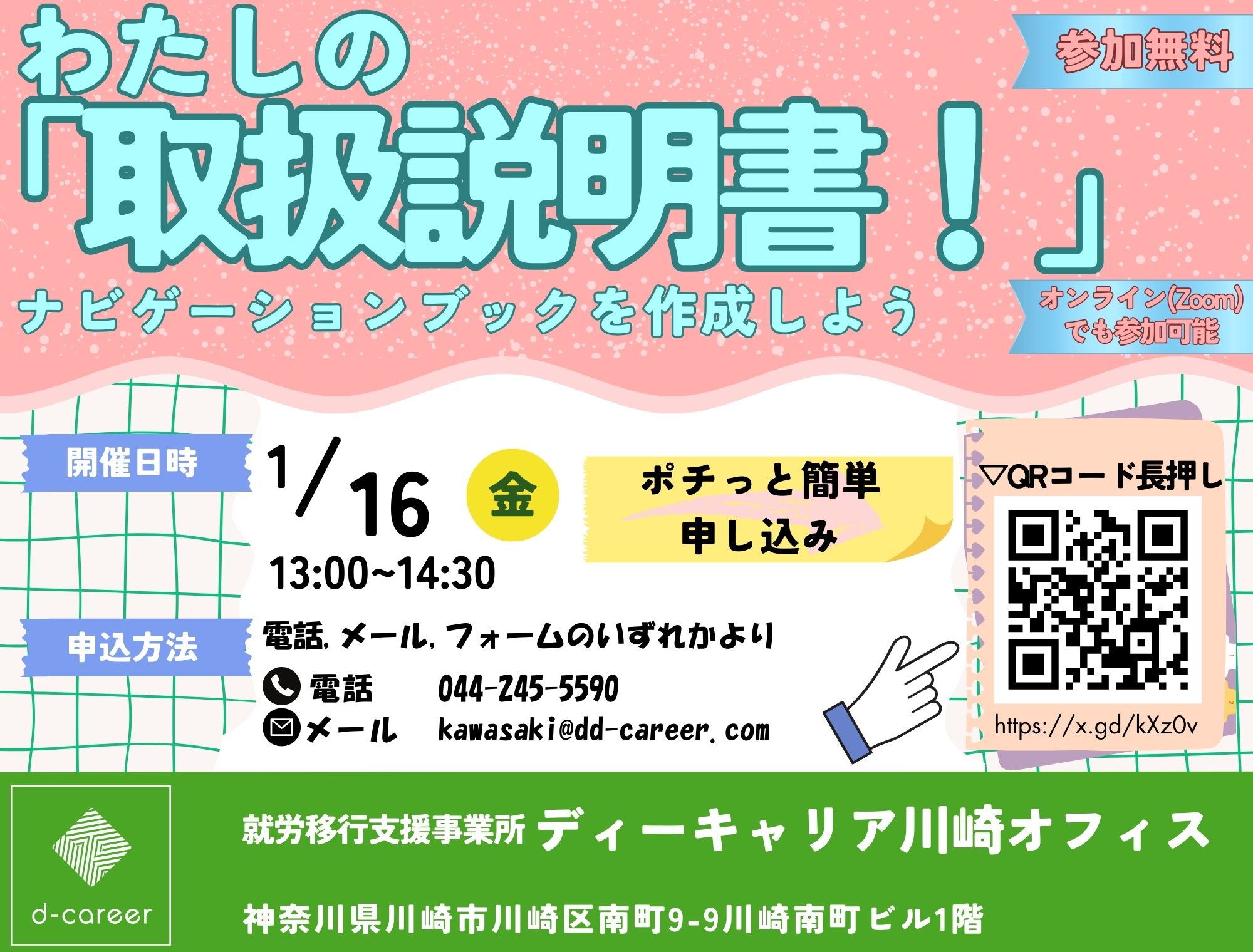【ディーキャリア川崎オフィス】01月16日(金)「<地域限定:川崎市、横浜市、大田区にお住まいの方対象>わたしの『取扱説明書!』ナビゲーションブックを作成しよう!」