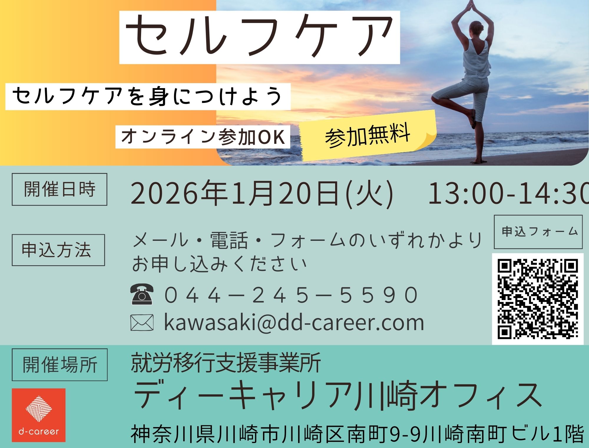 【ディーキャリア川崎オフィス】01月20日(火)「<地域限定:川崎市、横浜市、大田区にお住まいの方対象> ストレスケアを身に付けよう!セルフケア」