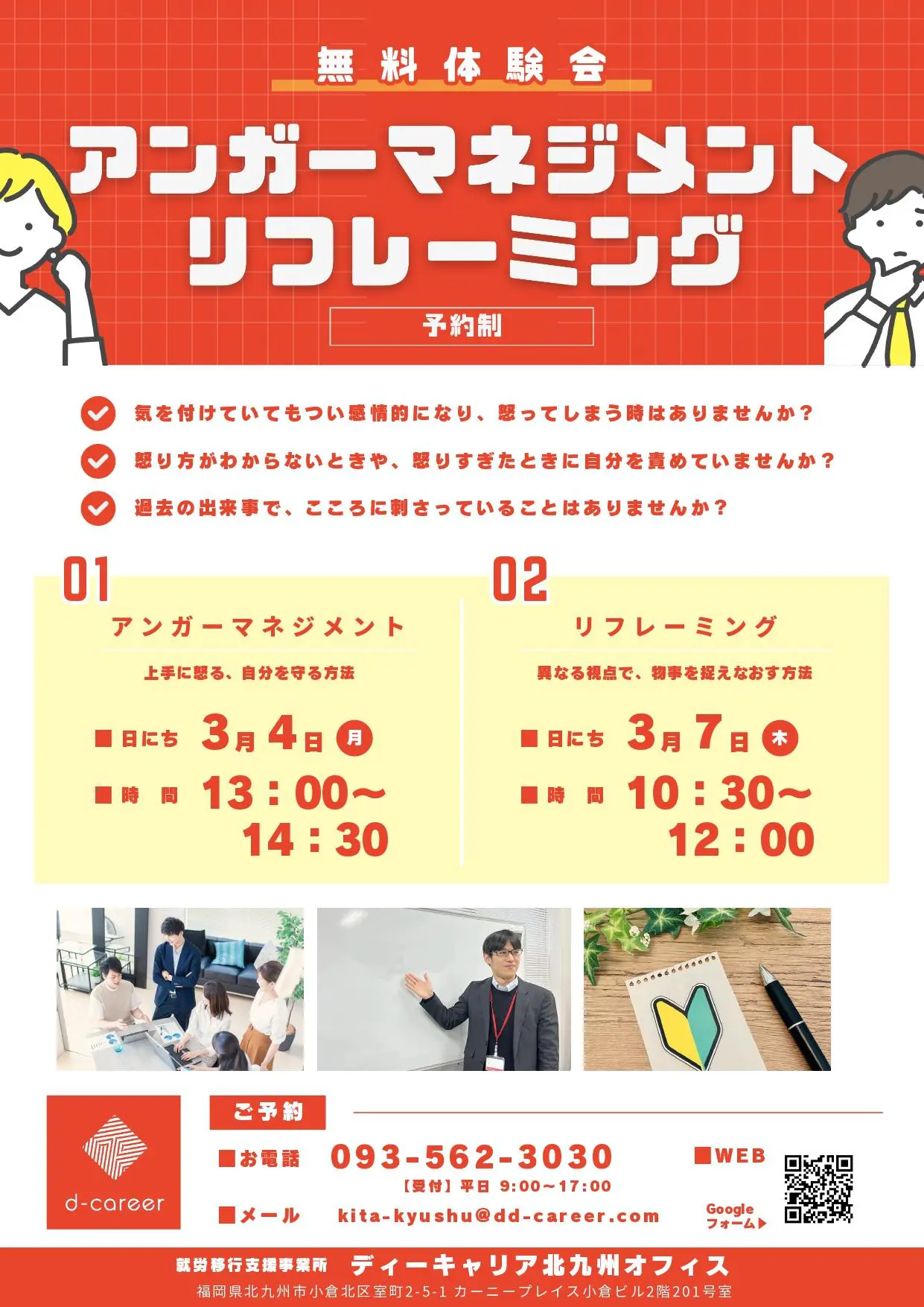 【ディーキャリア北九州オフィス】3月4日(月)・7日(木)「必見!アンガーマネジメント・リフレーミング無料体験会」