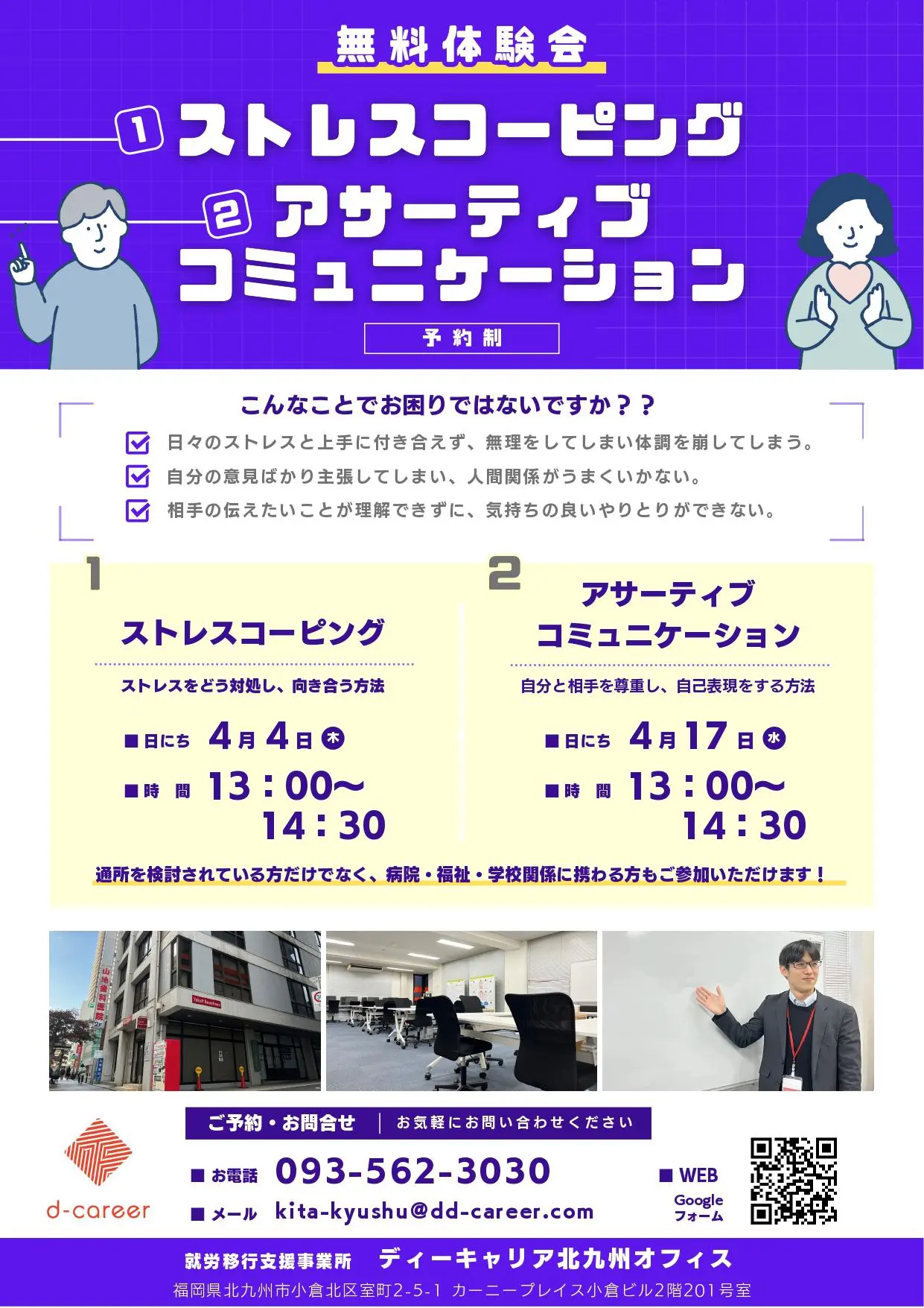 【ディーキャリア北九州オフィス】4月4日(木)・17日(水)「無料!ストレスコーピング・アサーティブコミュニケーション体験会」