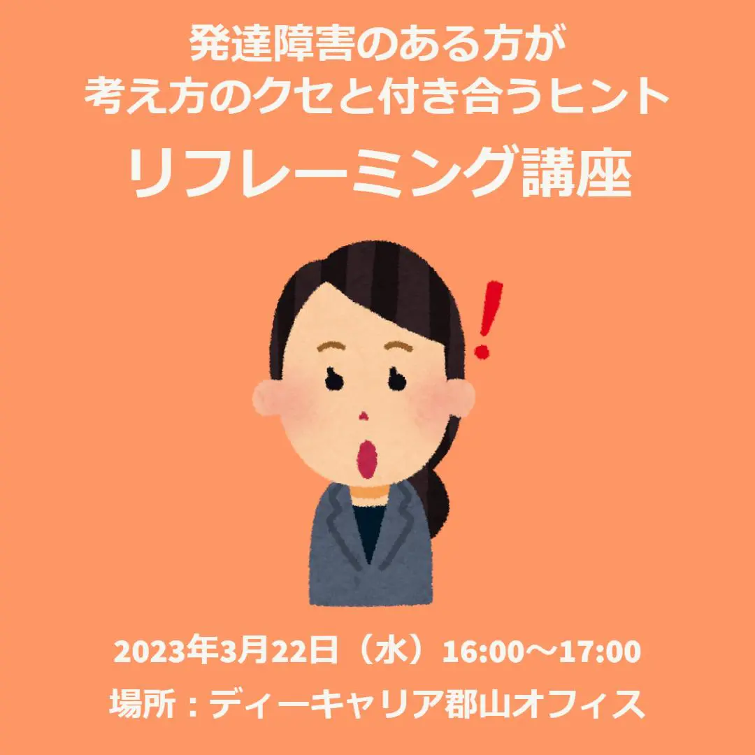 【ディーキャリア郡山オフィス】3月22日(水)「発達障害のある方が考え方のクセと付き合うヒント~リフレーミング講座~」