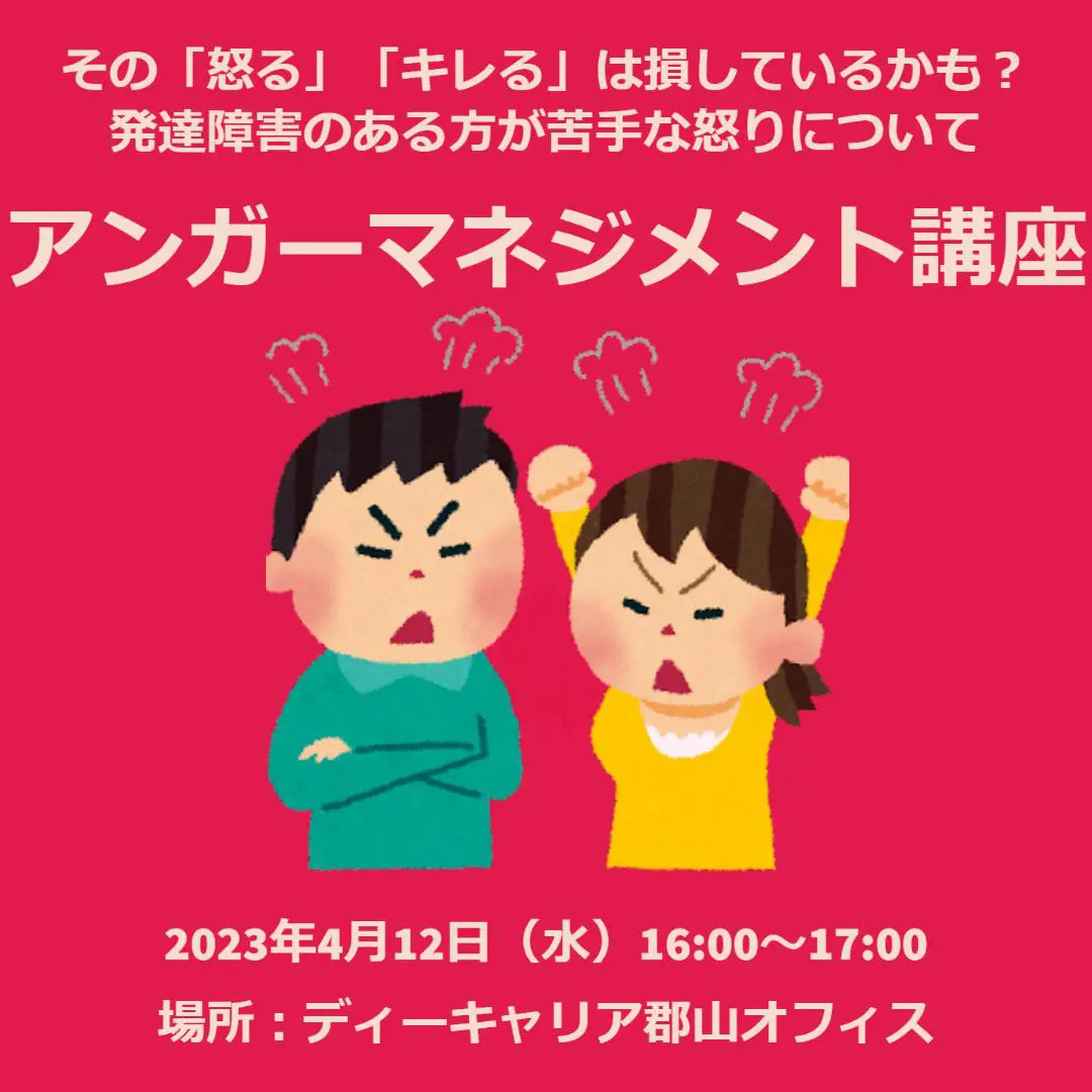 【ディーキャリア郡山オフィス】4月12日(水) 「その「怒る」「キレる」は損しているかも? 発達障害のある方が苦手な怒りについて~アンガーマネジメント講座~」