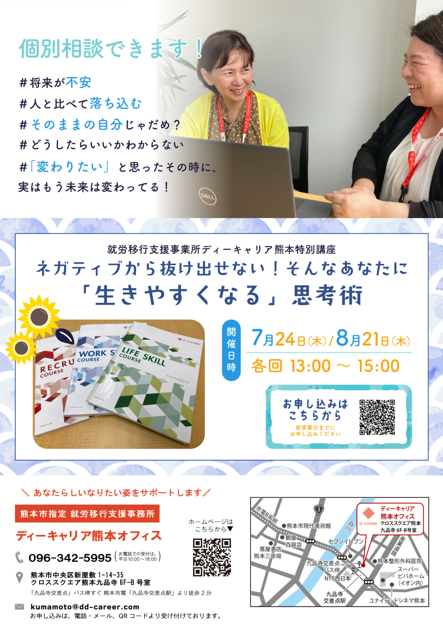 【ディーキャリア熊本オフィス】7月24日(木)・8月21日(木)「『生きやすくなる』思考術」