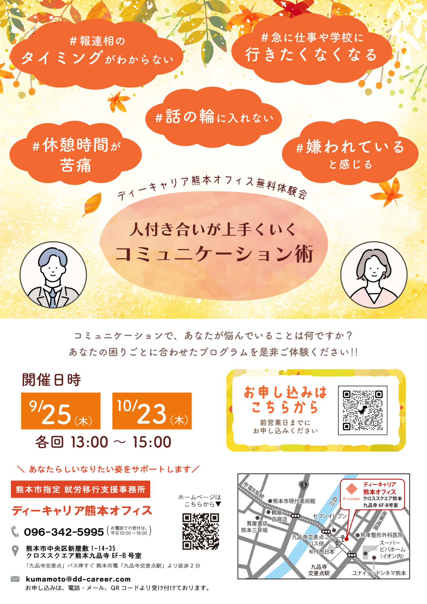 【ディーキャリア熊本オフィス】9月25日(木)・10月23日(木)「『人付き合いが上手くいく コミュニケーション術』無料体験会」