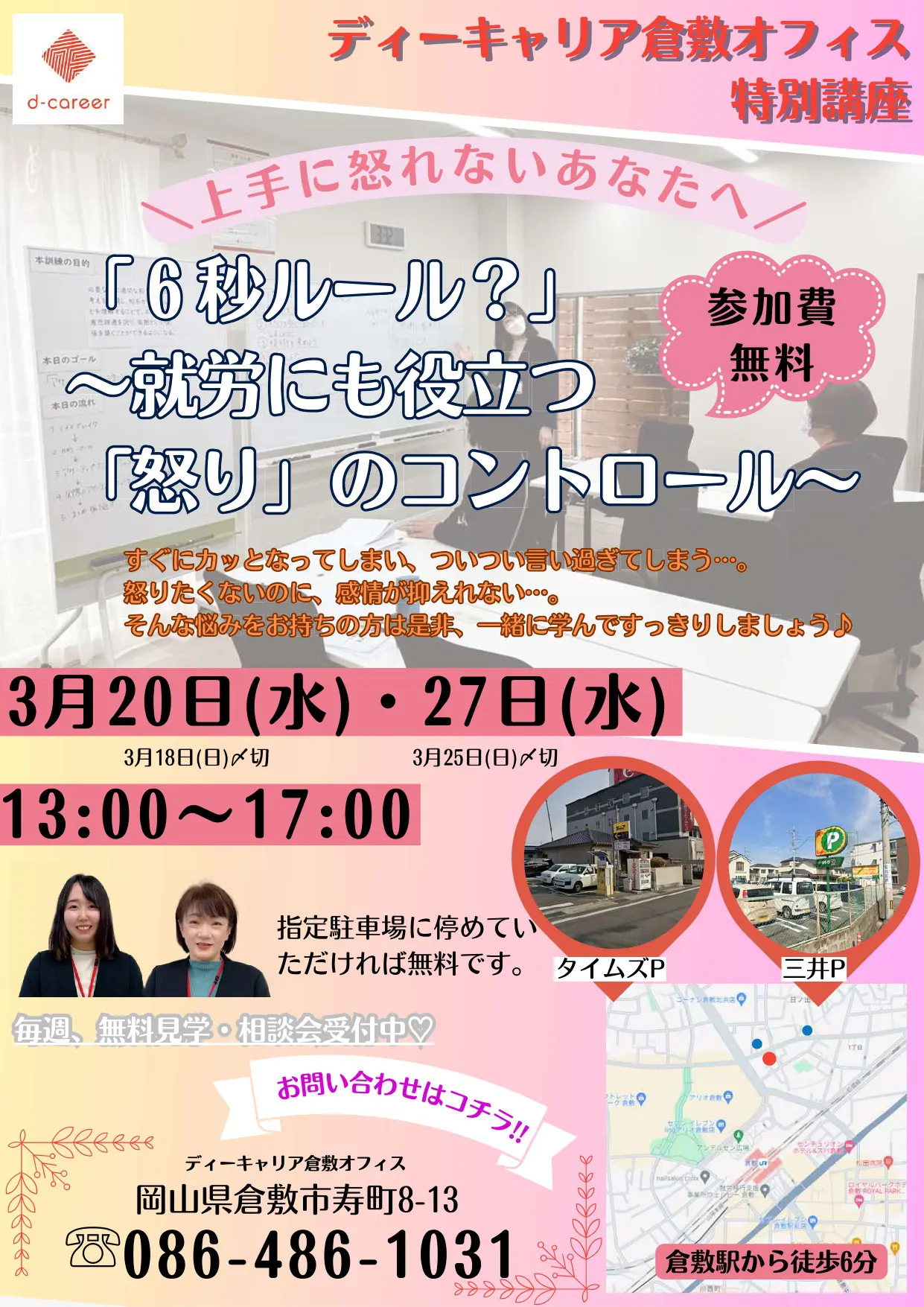 【ディーキャリア倉敷オフィス】3月20日(水・祝)・27日(水)「「6秒ルール?」就労にも役立つ「怒り」のコントロール」