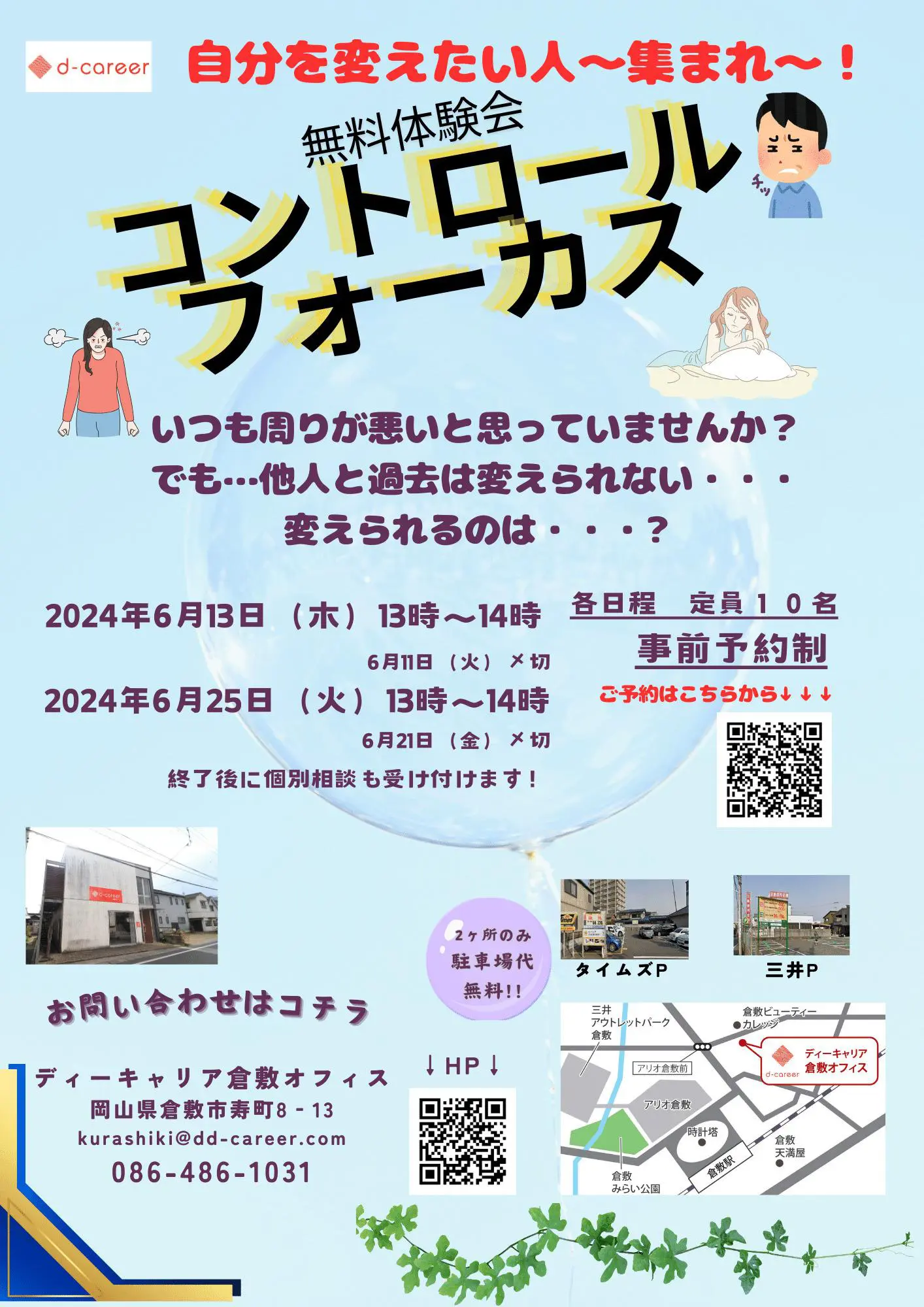 【ディーキャリア倉敷オフィス】6月13日(木)・25日(火)「自分を変えたい人~集まれ~! コントロールフォーカス」