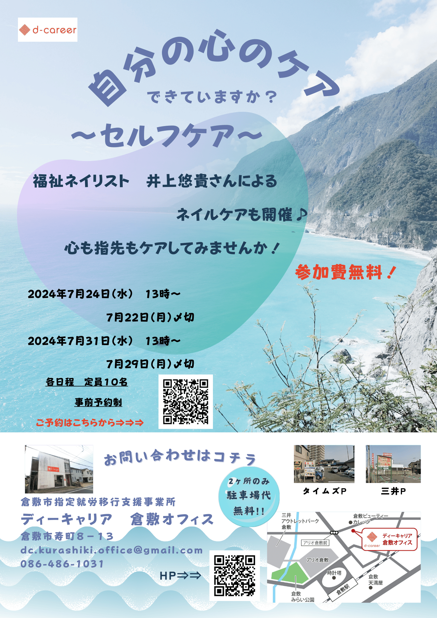 【ディーキャリア倉敷オフィス】7月24日(水)・31日(水)「自分の心のケアできていますか? ~セルフケア~」