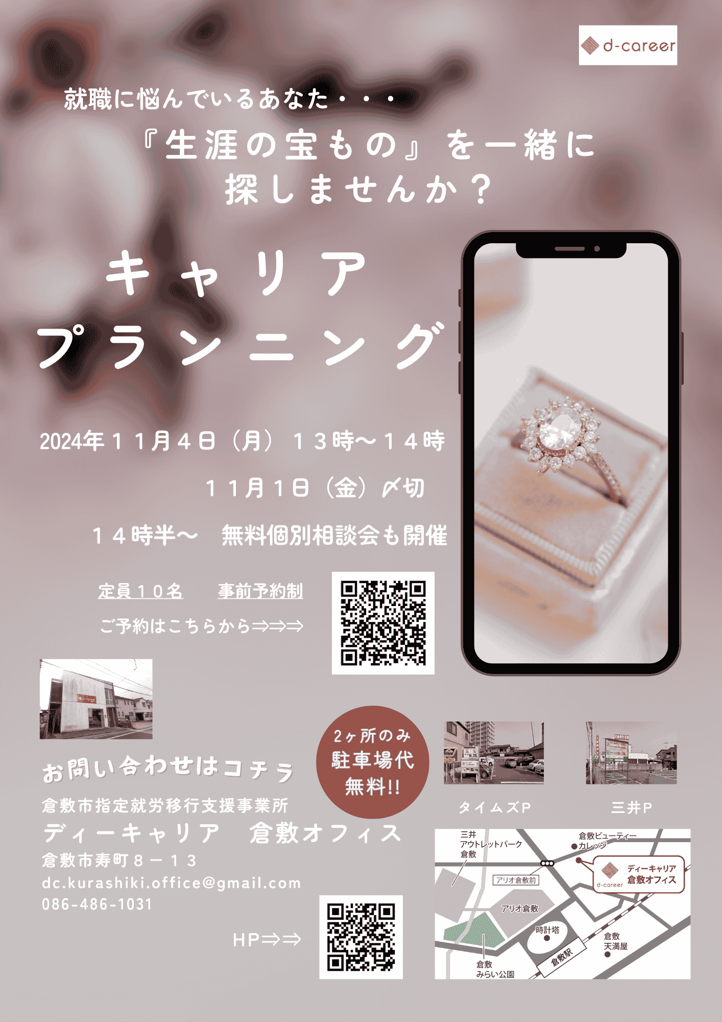 【ディーキャリア倉敷オフィス】11月04日(月)「就職になやんでいるあなた・・・『生涯の宝もの』を一緒に探しませんか? キャリアプランニング」