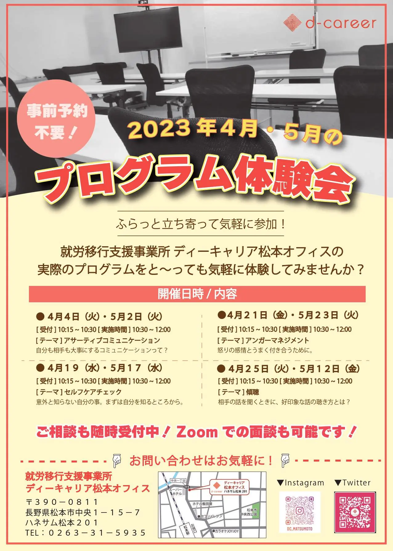 【ディーキャリア松本オフィス】5月02日(火)・12日(金)・17日(水)・23日(火)開催「プログラム体験会・無料相談会」