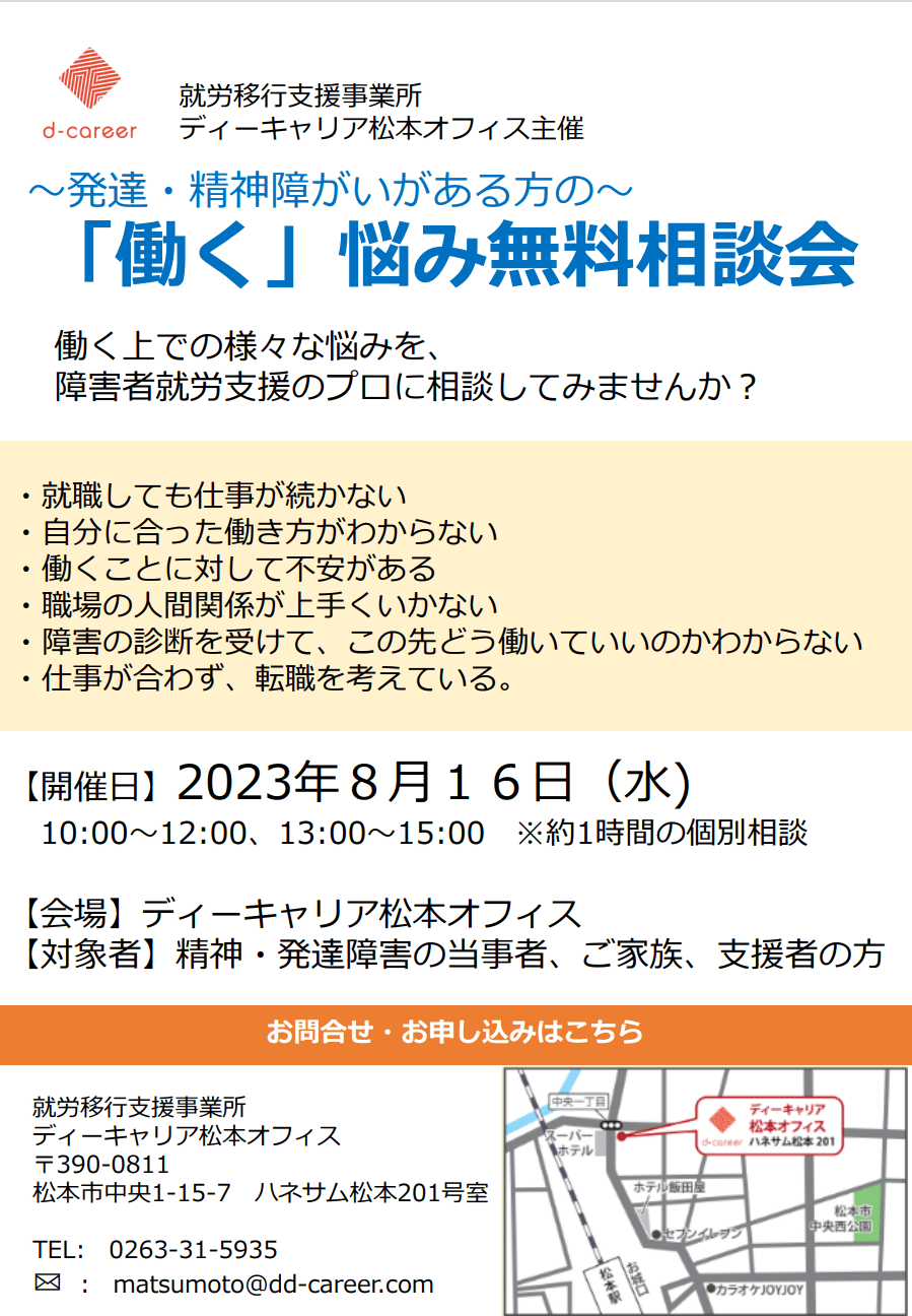 【ディーキャリア松本オフィス】8月16日(水)開催「発達・精神障がいがある方の「働く」悩み無料相談会」
