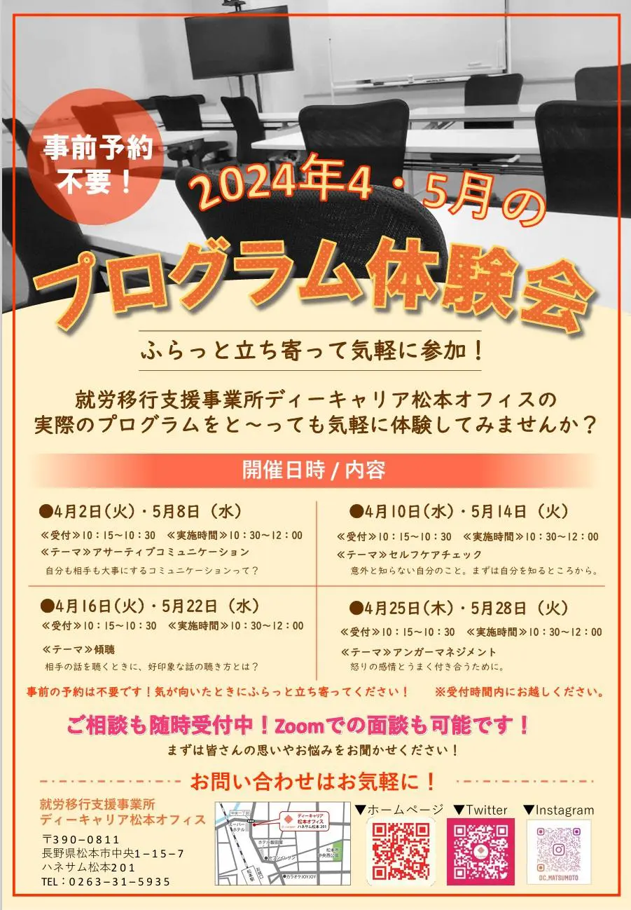 【ディーキャリア松本オフィス】5月08日(水)・14日(火)・22日(水)・28日(火)「ディーキャリア松本オフィス 5月プログラム体験会のお知らせ」
