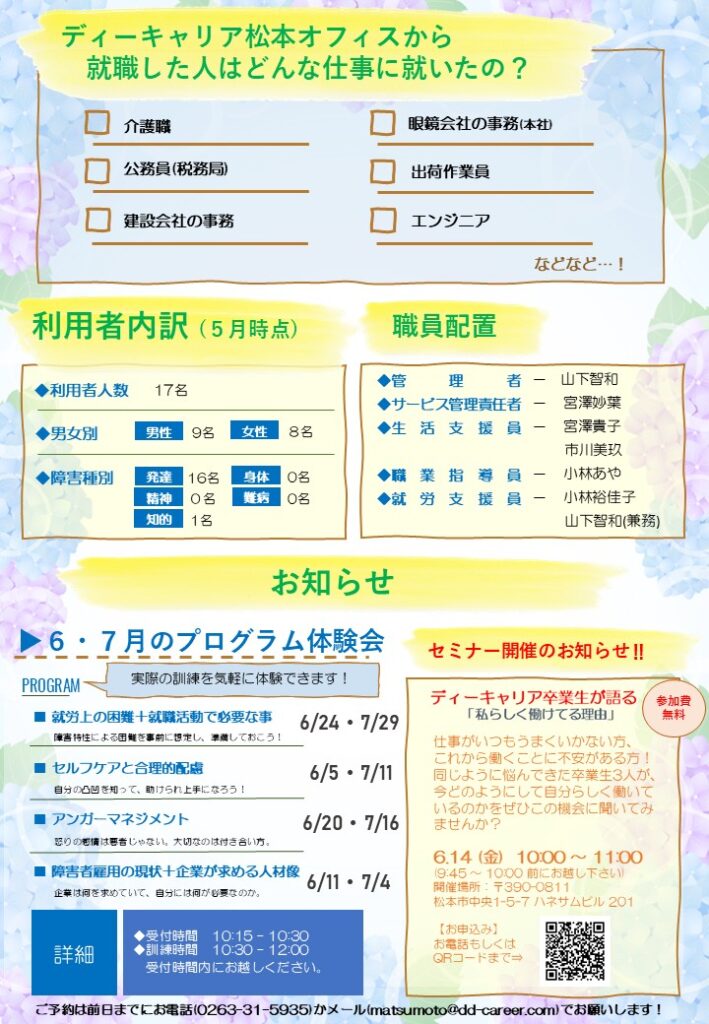 【ディーキャリア松本オフィス】6月05日(木)・11日(水)・20日(金)・24日(火)・7月04日(金)・11日(金)・16日(水)・29日(火)「ディーキャリア通信6月号・プログラム体験会のお知らせ」