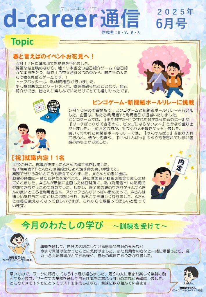 今回の6月号では、レクリエーション活動についてや、訓練・就職活動で感じた事、内定者についてなど、様々なトピックを掲載していますので、ぜひご覧ください✨
