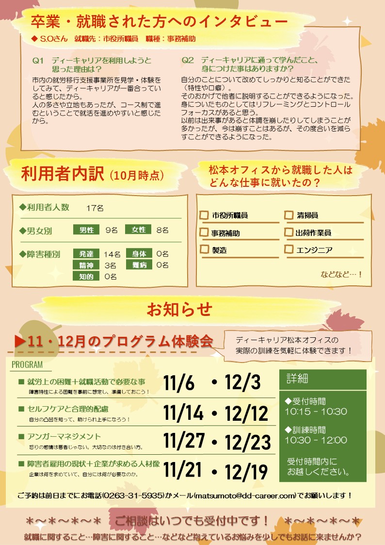 【ディーキャリア松本オフィス】11月06日(木)・14日(金)・21日(金)・27日(木)・12月03日(水)・12日(金)・19日(金)・23日(火)「ディーキャリア通信11月号・プログラム体験会のお知らせ」