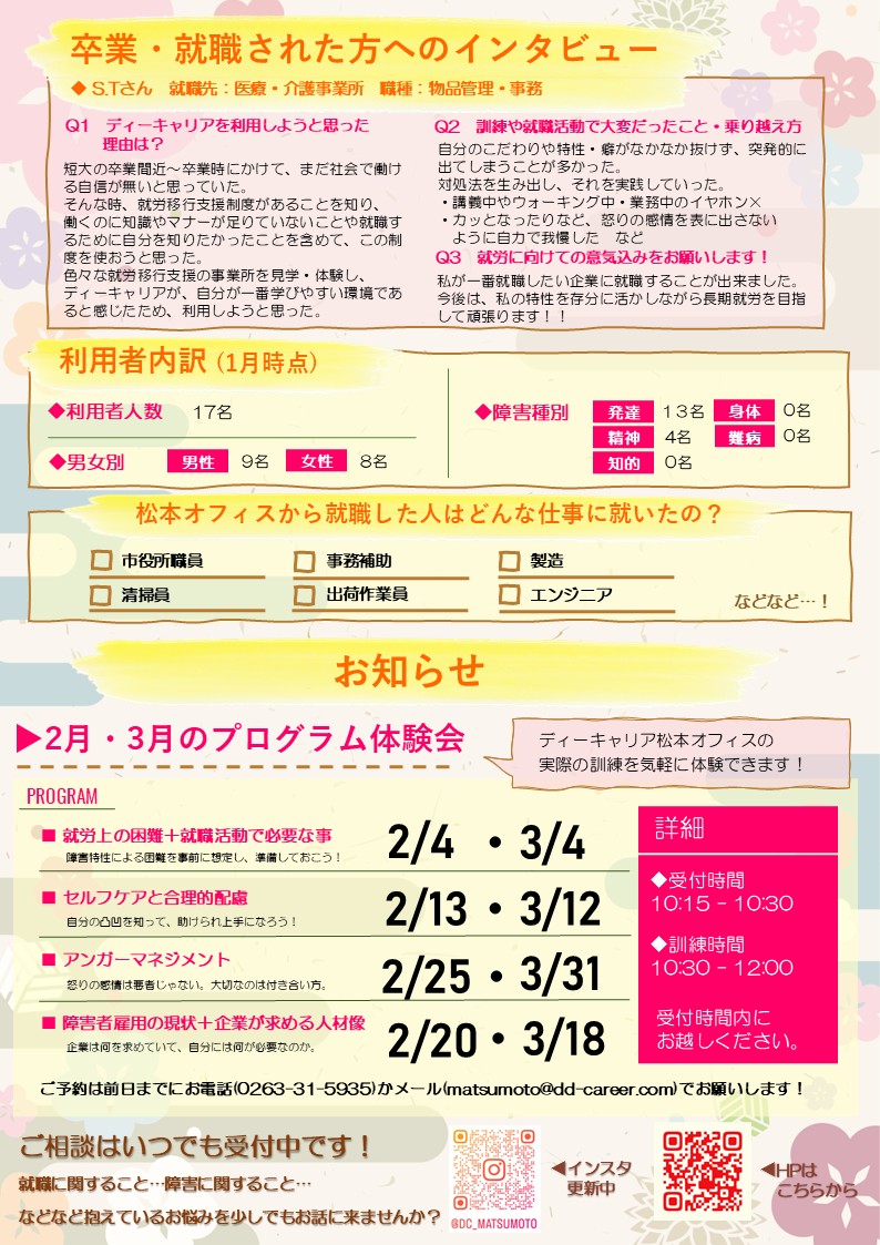 【ディーキャリア松本オフィス】02月04日(水)・13日(金)・20日(金)・25日(水)・03月04日(水)・12日(木)・18日(水)・31日(火)「【ディーキャリア松本オフィス】ディーキャリア通信2月号・プログラム体験会のお知らせ」