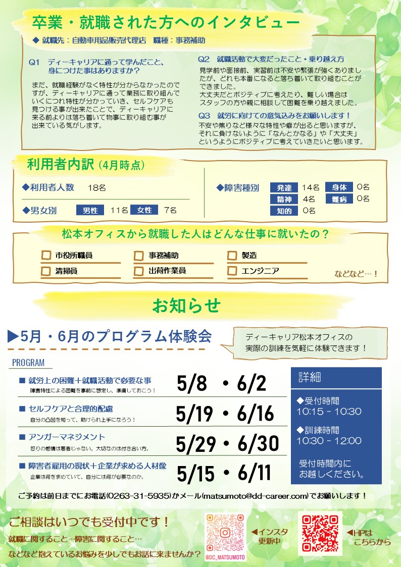 【ディーキャリア松本オフィス】05月08日(金)・15日(金)・19日(火)・29日(金)・06月02日(火)・11日(木)・16日(火)・30日(火)「ディーキャリア通信5月号・プログラム体験会のお知らせ」