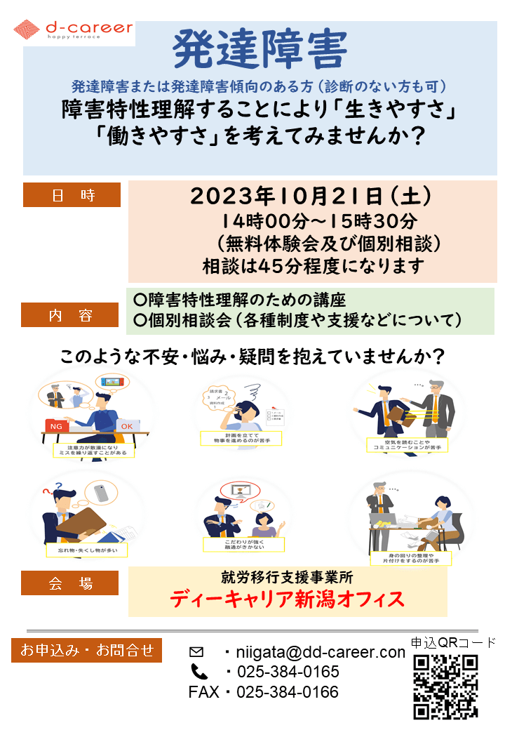 【ディーキャリア新潟オフィス】10月21日(土)「障害特性と自己理解~「生きやすさ」「働きやすさ」を考える」