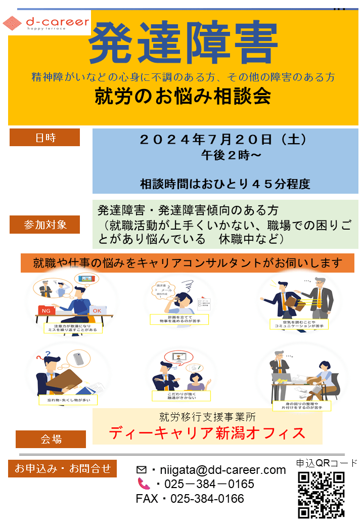 【ディーキャリア新潟オフィス】7月20日(土)「発達障害の方・障害のある方のための相談会」