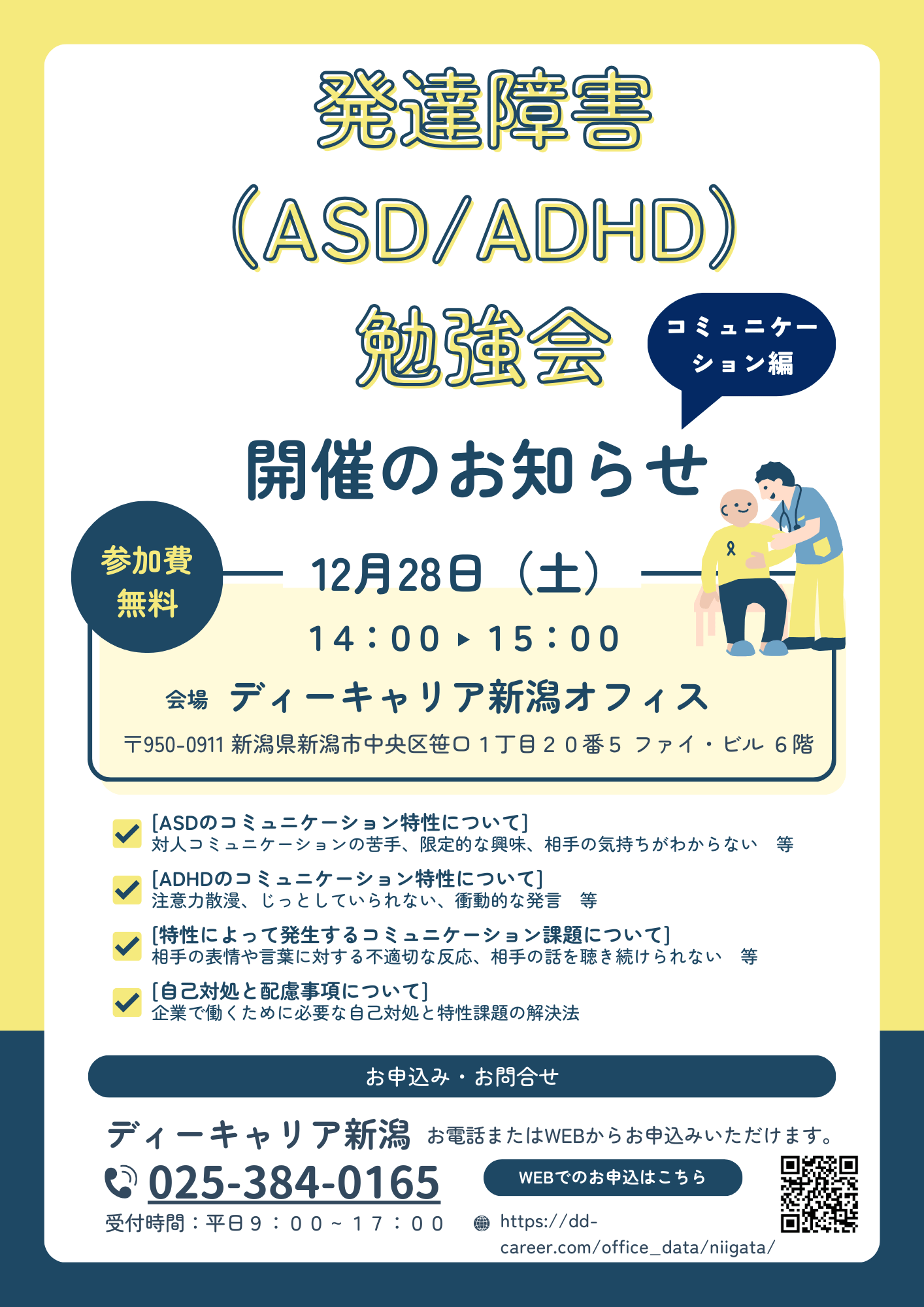【ディーキャリア新潟オフィス】12月28日(土)「大人の発達障害とは?特性勉強会」(コミュニケーション)