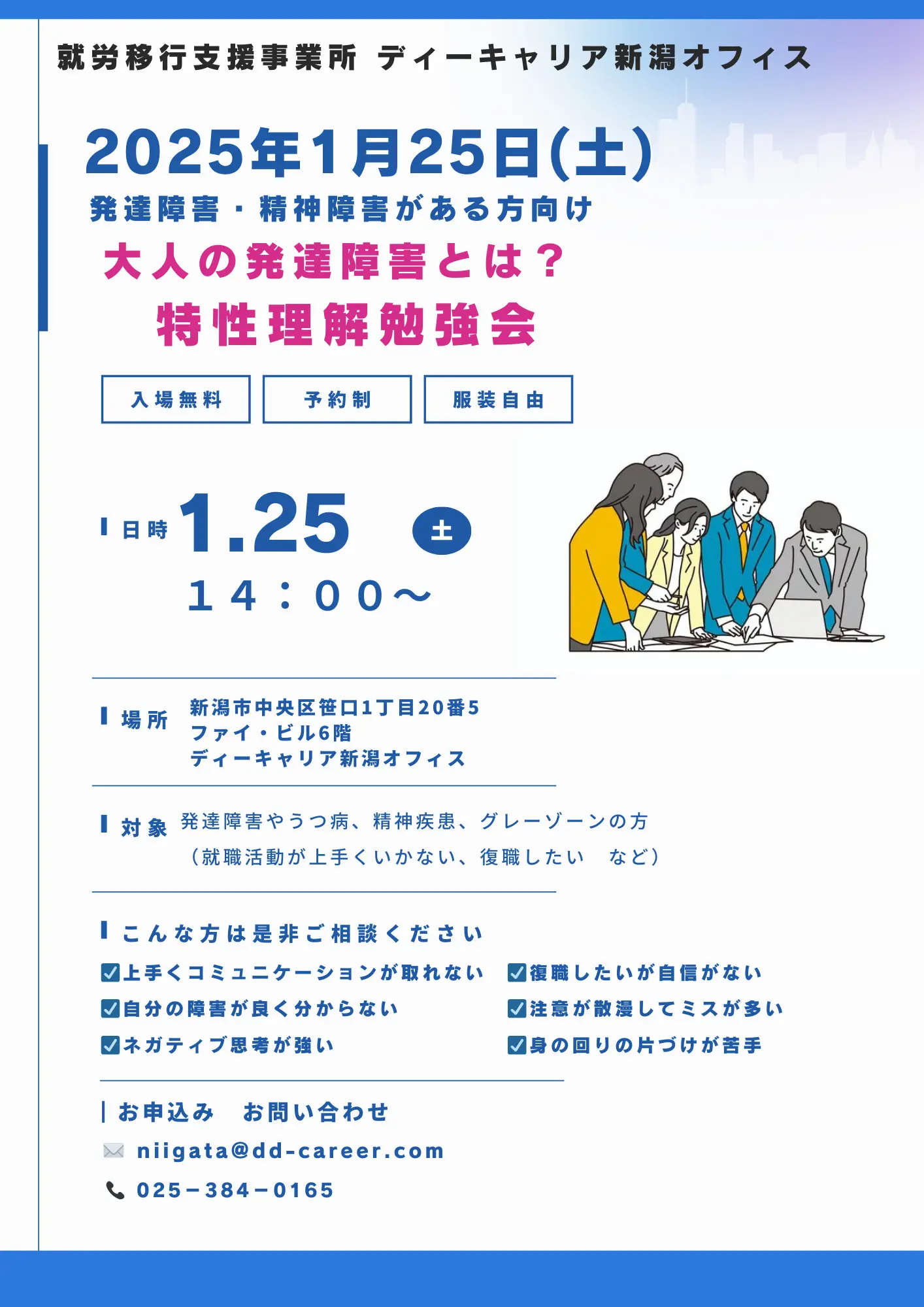 【ディーキャリア新潟オフィス】1月25日(土)「大人の発達障害とは?特性勉強会」