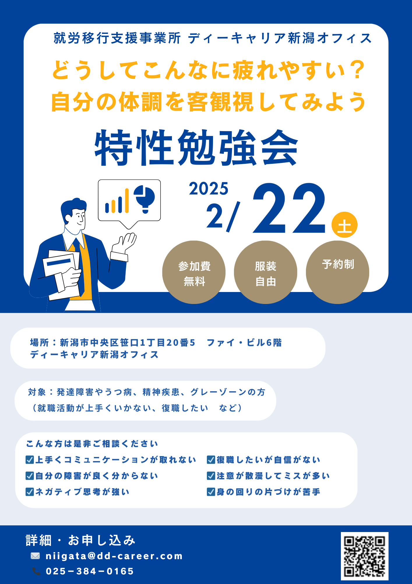 【ディーキャリア新潟オフィス】2月22日(土)「大人の発達障害とは?特性勉強会」(発達障害特性理解)