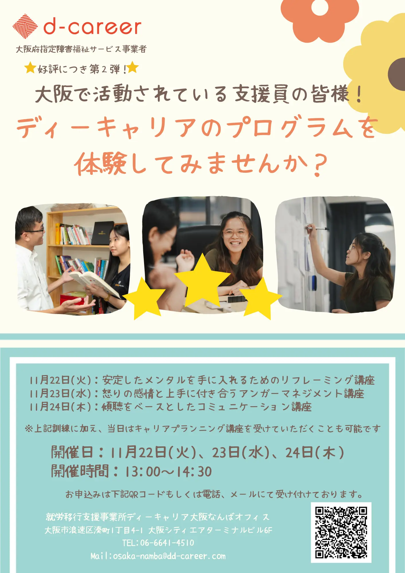 【ディーキャリア大阪なんばオフィス】11月22日(火)・23日(水)・24日(木)「<大阪で活動している支援員の方向け>ディーキャリアのプログラムを体験しませんか?」