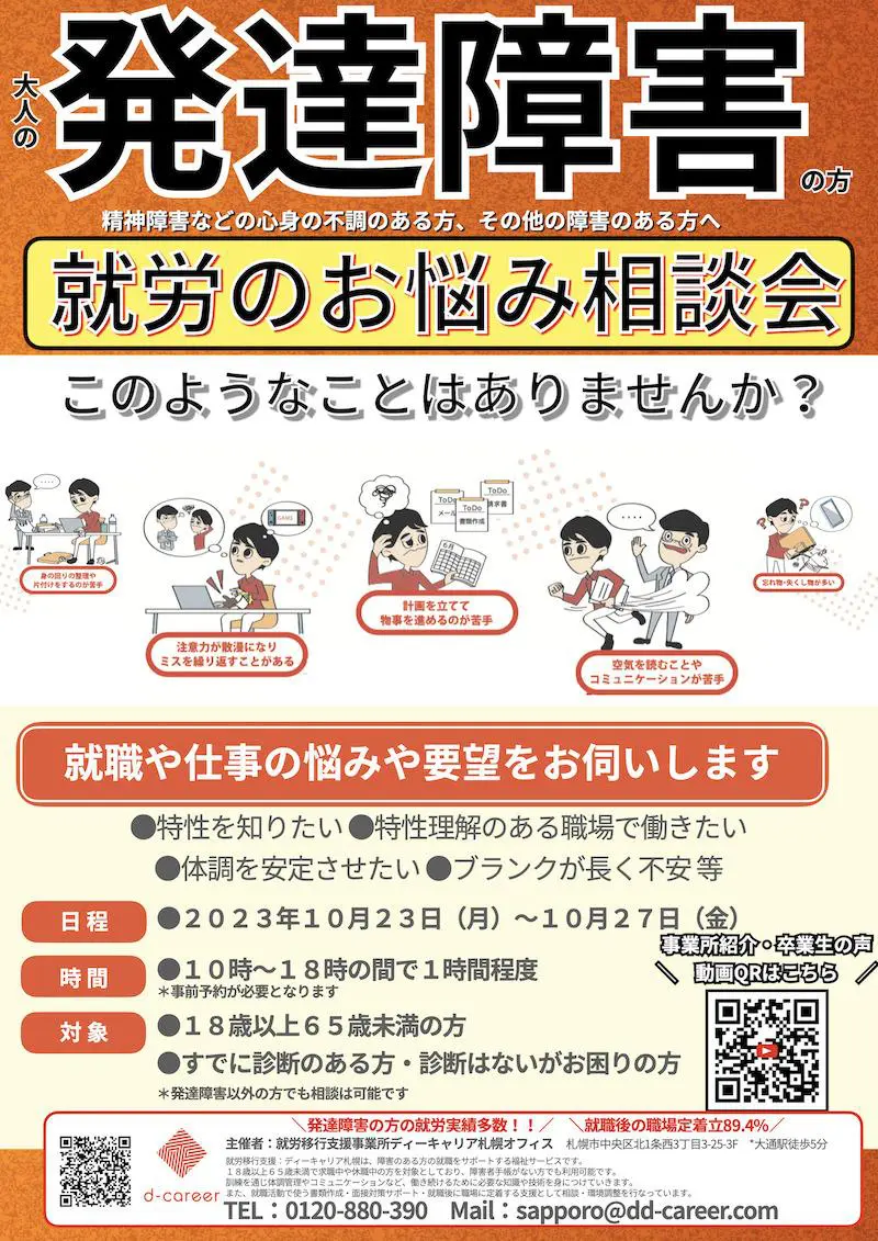 【ディーキャリア札幌オフィス】10月23日(月)・24日(火)・25日(水)・26日(木)・27日(金)「発達障害の方・障害のある方のための就労相談会」