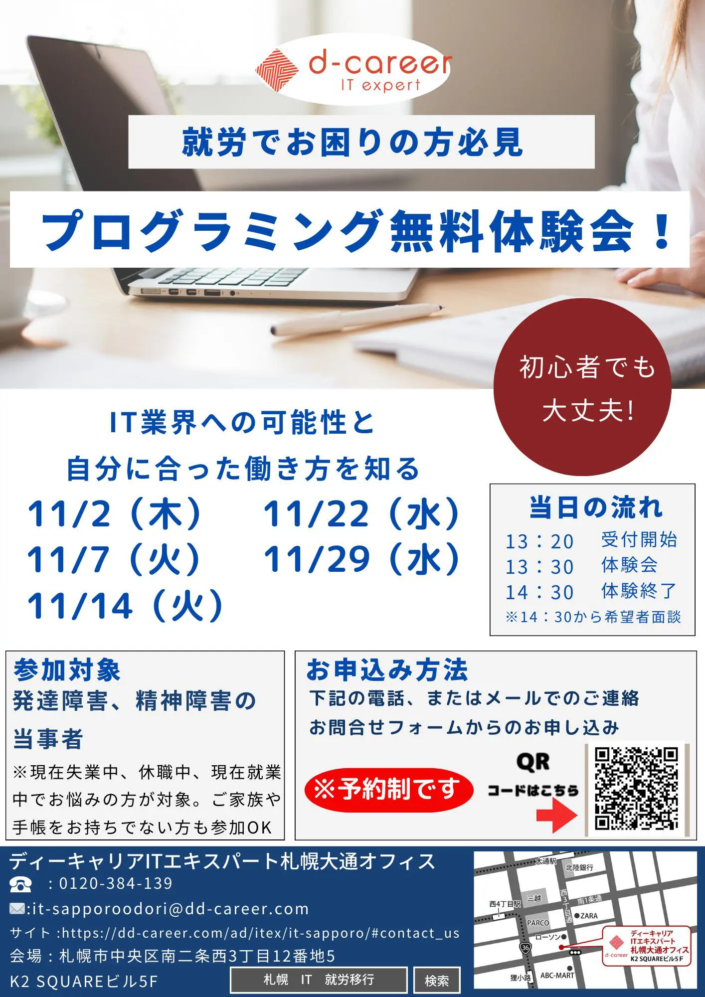 【ディーキャリアITエキスパート札幌大通オフィス 】11月07日(火)・14日(火)・22日(水)・29日(水)「プログラミング無料体験会」