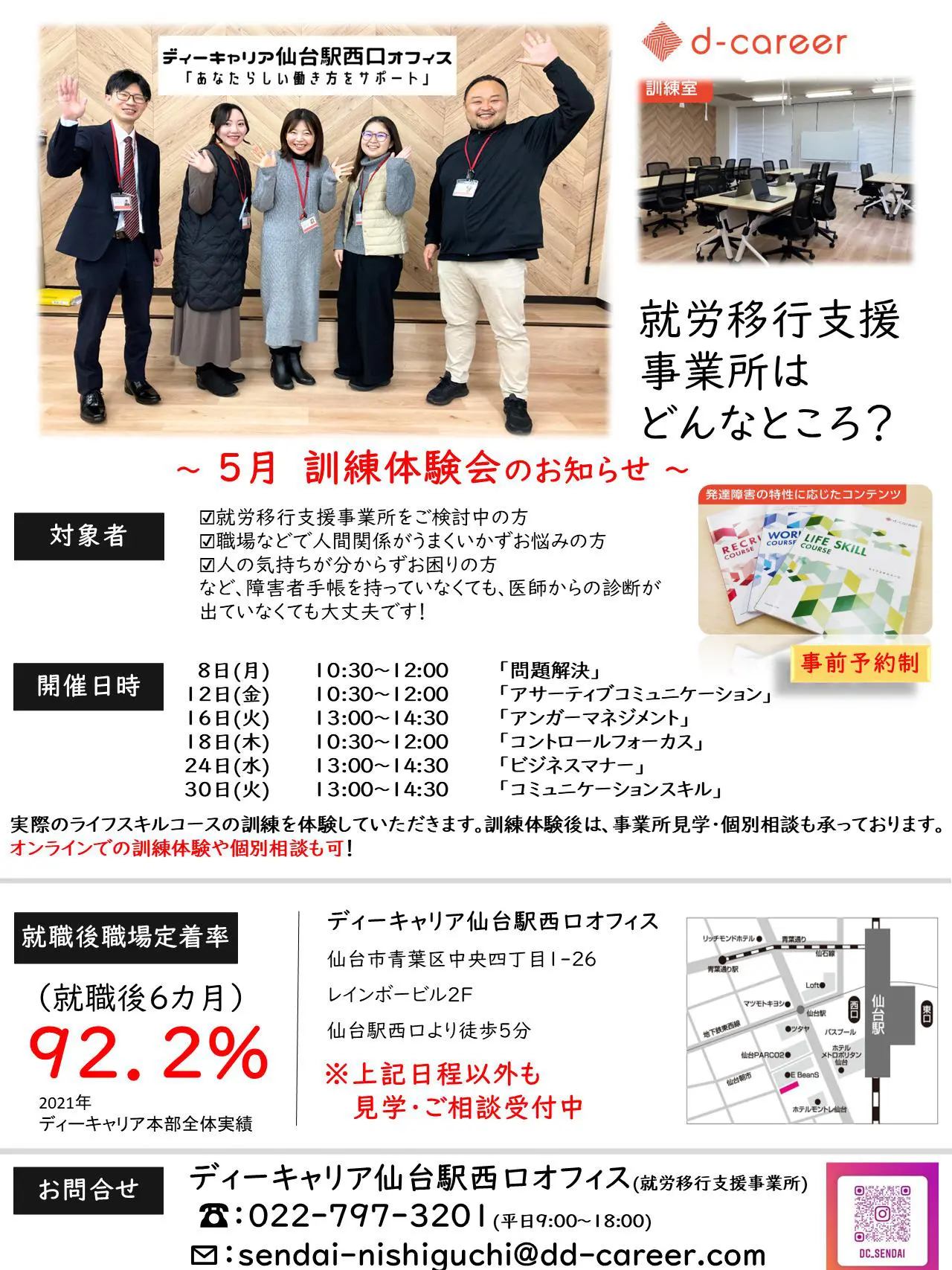 【ディーキャリア仙台駅西口オフィス】2023年5月開催「ライフスキルコース訓練体験会のお知らせ」【無料・オンライン対応可】
