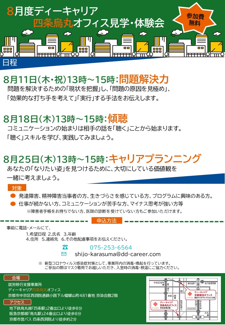 【ディーキャリア四条烏丸オフィス】8月11日(木)・18日(木)・25日(木)「見学・体験会」