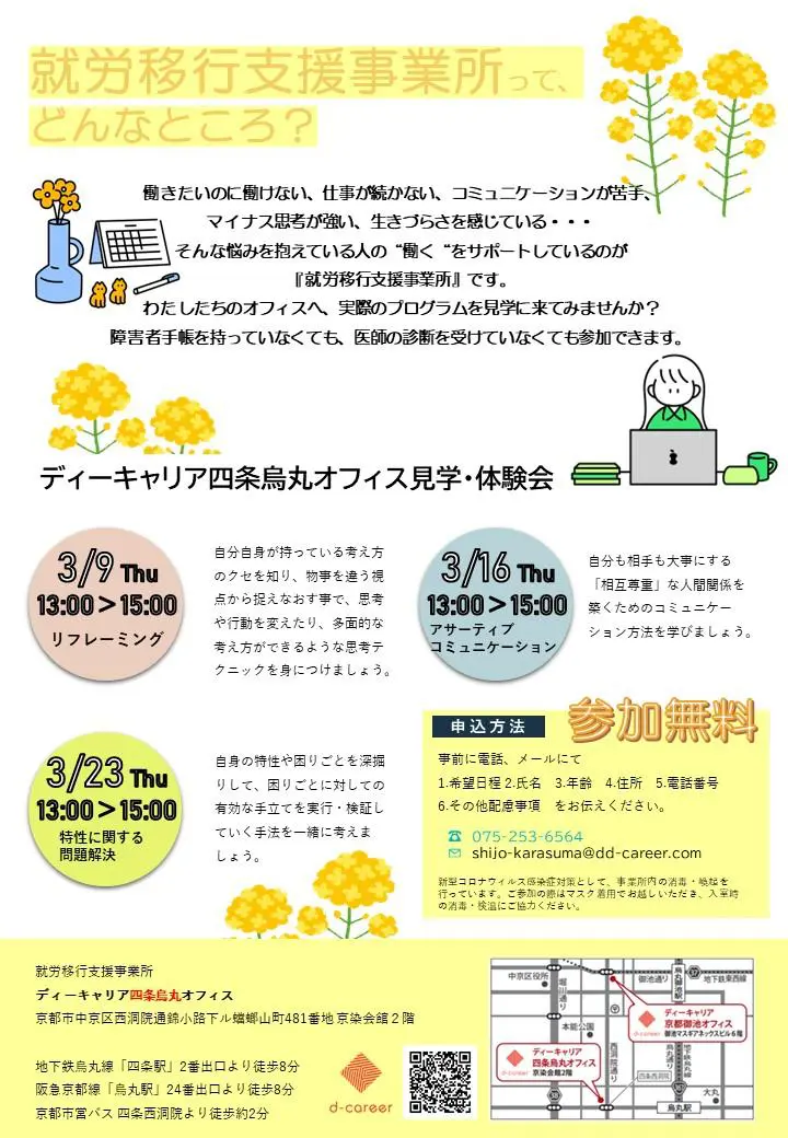 【ディーキャリア四条烏丸オフィス】3月09日(木)・16日(木)・23日(木)「見学・体験会」