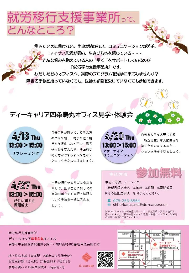 【ディーキャリア四条烏丸オフィス】4月13日(木)・20日(木)・27日(木)「見学・体験会」