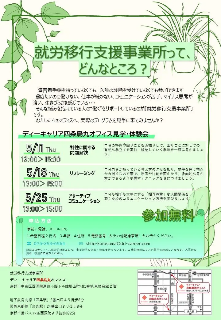 【ディーキャリア四条烏丸オフィス】5月11日(木)・18日(木)・25日(木)「見学・体験会」