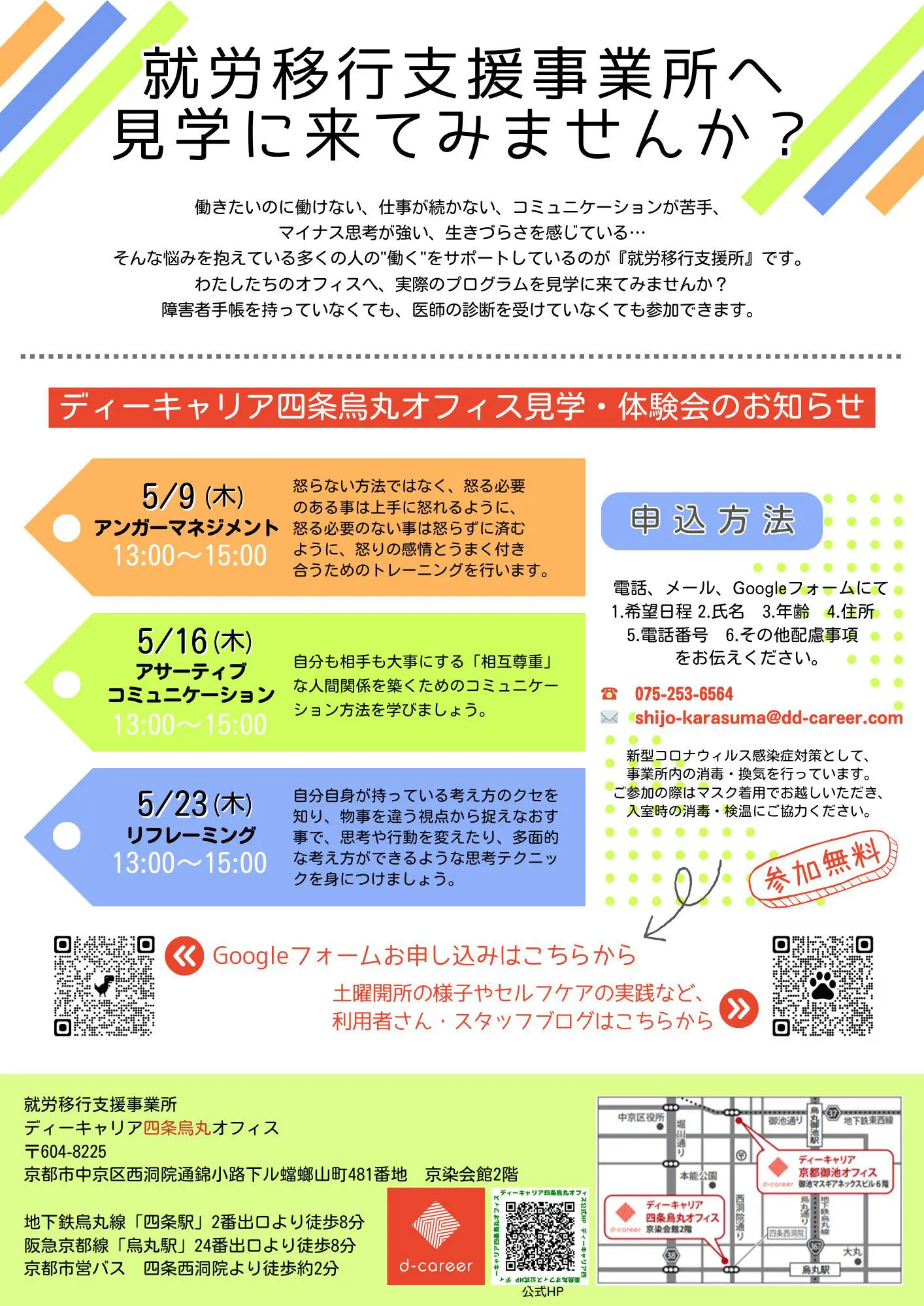 【ディーキャリア四条烏丸オフィス】5月09日(木)・16日(木)・23日(木)「見学・体験会」
