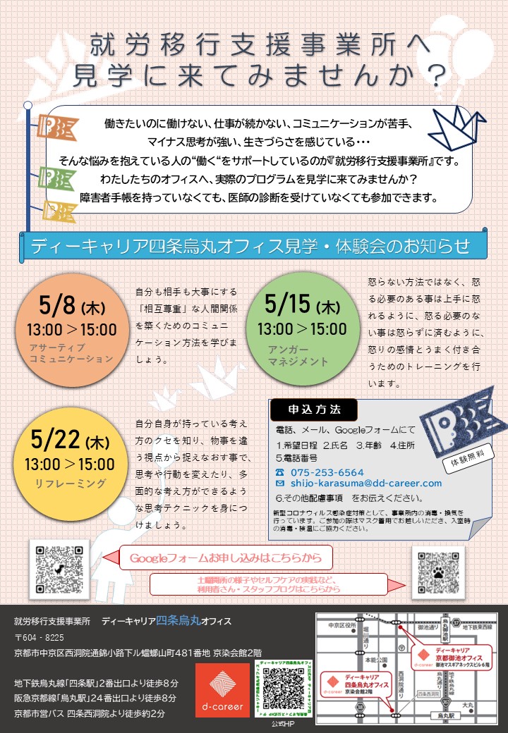【ディーキャリア四条烏丸オフィス】5月08日(木)・15日(木)・22日(木)「見学・体験会」