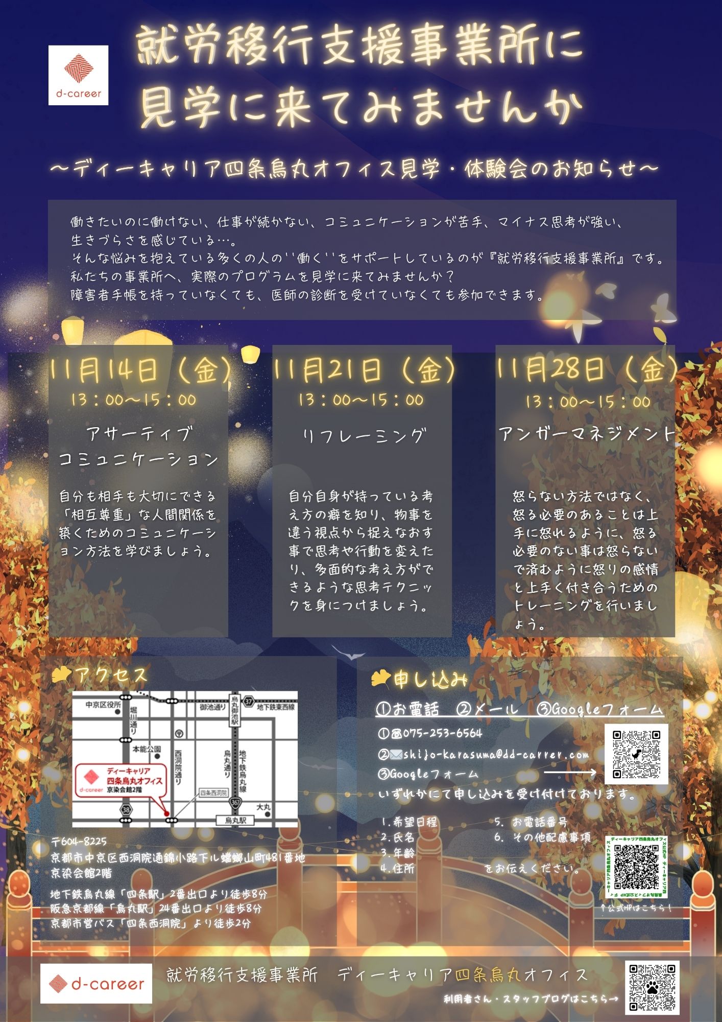 【ディーキャリア四条烏丸オフィス】11月09日(木)・16日(木)・23日(木)(祝)「見学・体験会」