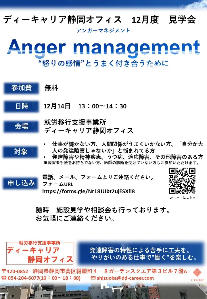 【ディーキャリア静岡オフィス】12月14日(水)「Anger management~アンガーマネジメント~怒りをマネジメントする!?」