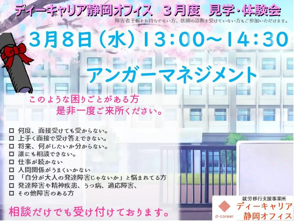 【ディーキャリア静岡オフィス】3月08日(水)「見学・体験会 怒りをコントロール!アンガーマネジメント」
