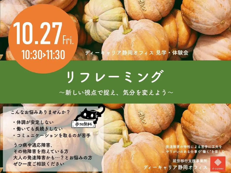 【ディーキャリア静岡オフィス】10月27日(金)「プログラム見学・体験会のお知らせ」