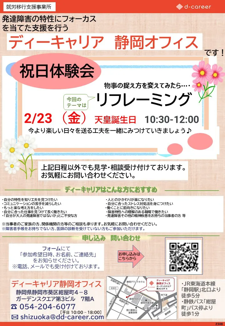 【ディーキャリア静岡オフィス】2月23日(金)「リフレーミング体験会」
