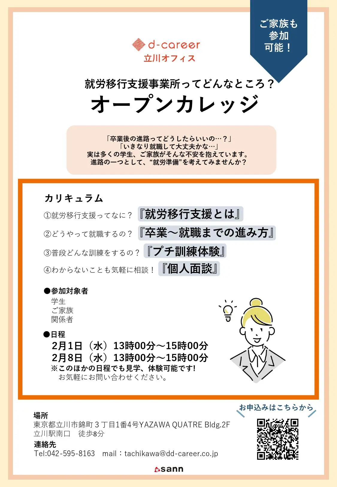 【ディーキャリア立川オフィス】2月1日(水)・8日(水)「就労移行支援事業所ってどんなところ?オープンカレッジ」