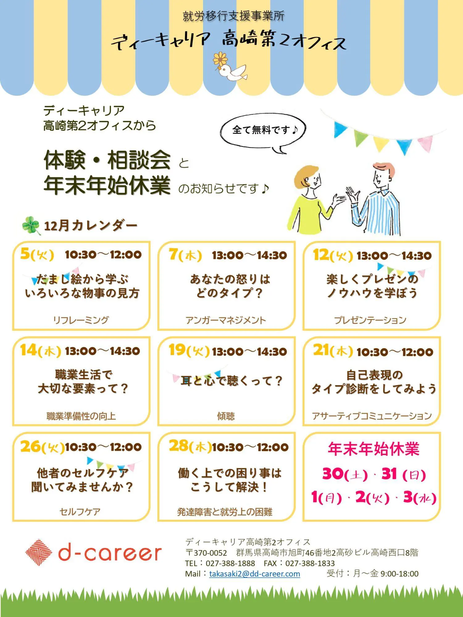 【ディーキャリア高崎第2オフィス】12月05日(火)・07日(木)・12日(火)・14日(木)・19日(火)・21日(木)・26日(火)・28日(木)開催「無料体験会&相談会」