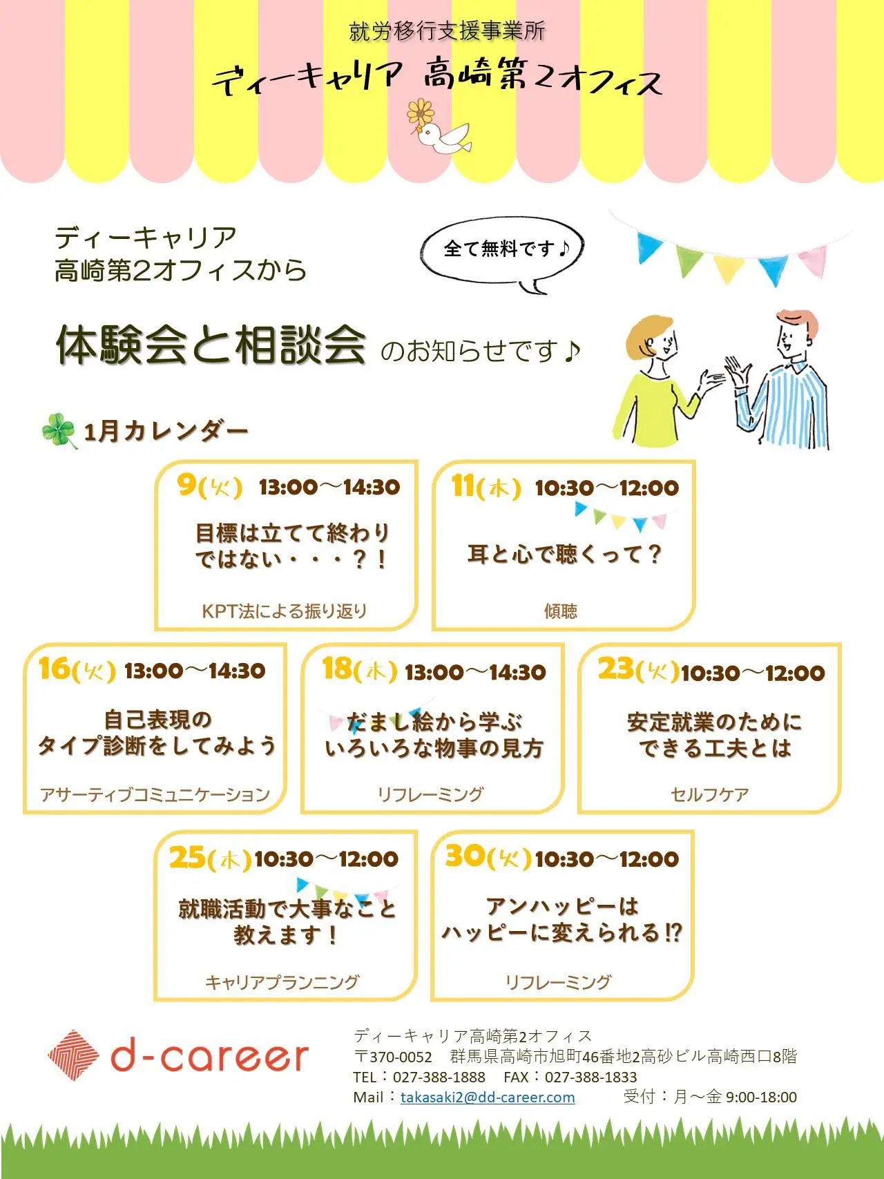 【ディーキャリア高崎第2オフィス】1月9日(火)・11日(木)・16日(火)・18日(木)開催「1月の無料体験会&相談会」