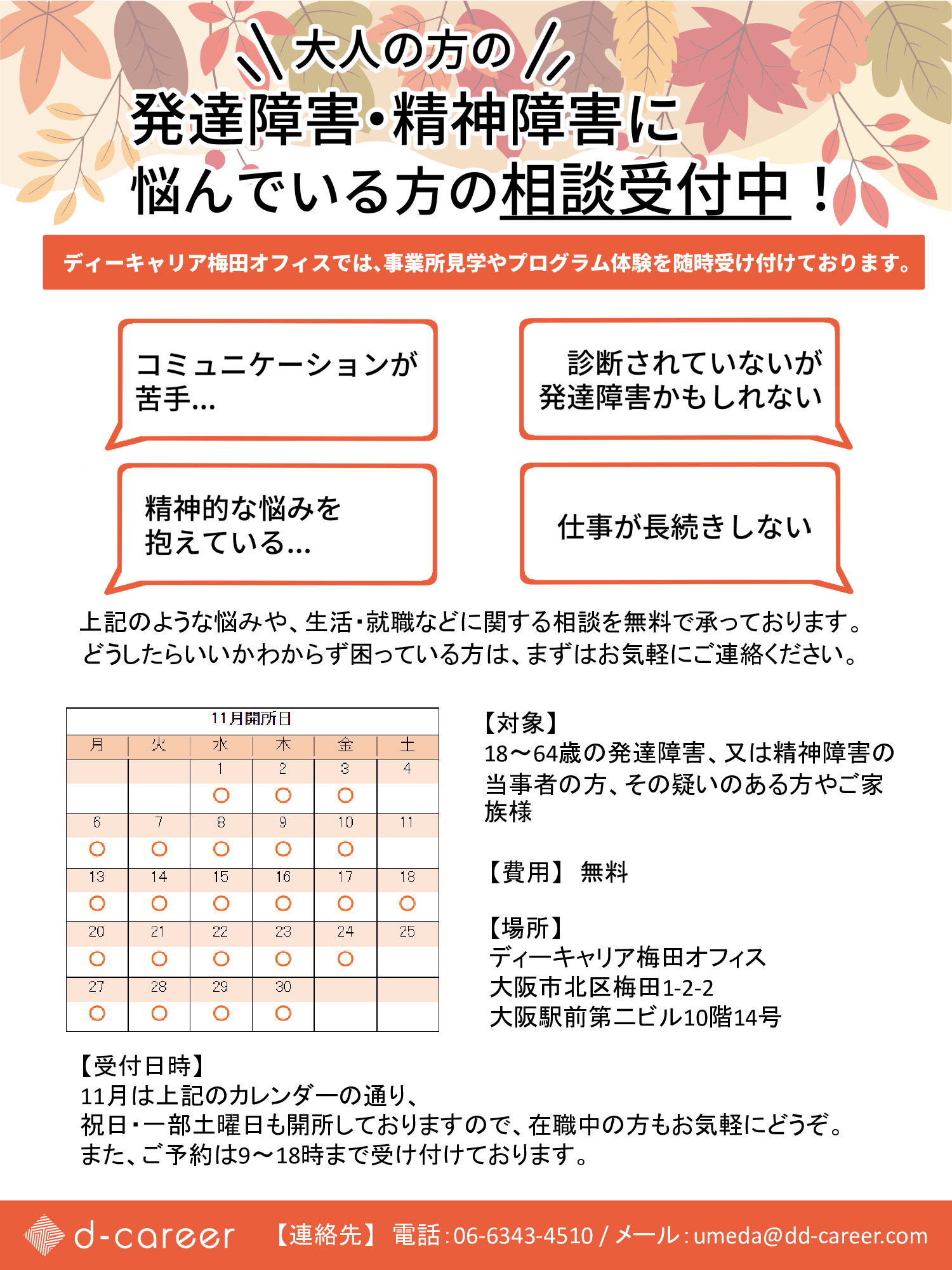 【ディーキャリア梅田オフィス】11月平日開催「11月の事業所見学・体験日のお知らせ」