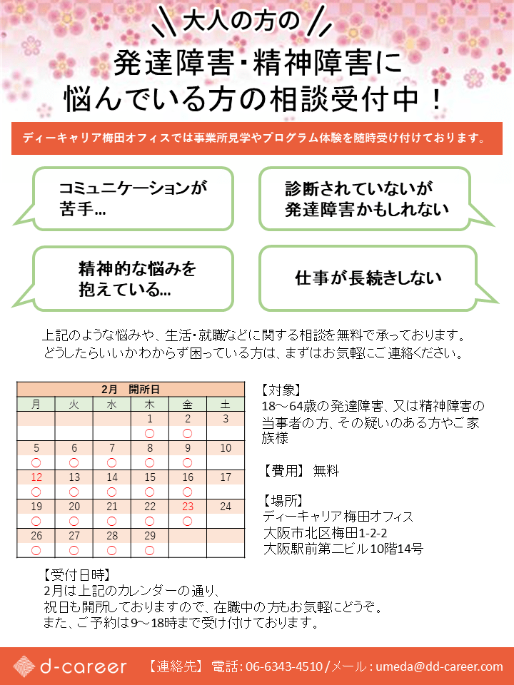 【ディーキャリア梅田オフィス】2月平日・祝日開催「2月の事業所見学・体験日のお知らせ」