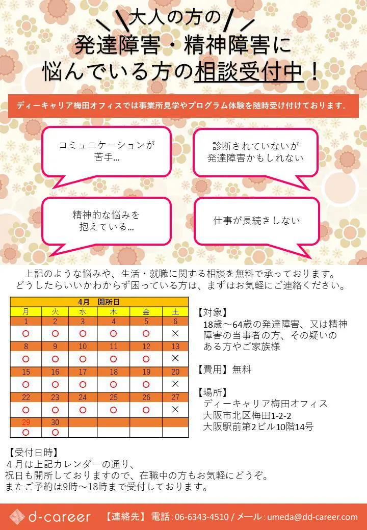 【ディーキャリア梅田オフィス】4月平日・祝日開催「4月の事業所見学・体験日のお知らせ」