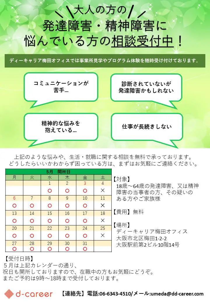 【ディーキャリア梅田オフィス】5月平日・祝日開催「5月の事業所見学・体験日のお知らせ」