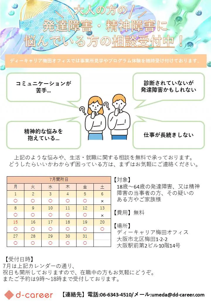 大人の発達障害・精神障害に悩んでいる方の相談や事業所の見学、